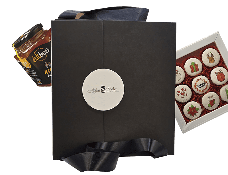 - macarons și tabletele de ciocolată sunt produse de Atelier Cortez cu o experiență de peste 10 ani în producția de cadouri pentru afacerile din România.
